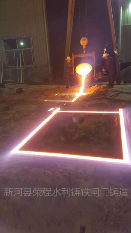 鑄鐵閘門澆注鑄造中,工作人員在認(rèn)真工作。鑄鐵閘門是一種小型平板閘門,廣泛使用于取水輸水、市政建設(shè),給水排水、農(nóng)田灌溉等工程中,通常設(shè)置在渠道、涵管的進(jìn)水口,用作工作閘門調(diào)節(jié)流量、控制水位,或用作檢修閘門關(guān)閉孔口擋水。鑄鐵閘門有方形、圓形兩種。鑄鐵閘門一般由門葉和門框兩部分組成,門體和門框的材料為鑄鐵,一般整體鑄造、整體加工。門體一般采用面板與加強(qiáng)肋的結(jié)構(gòu),面板可做平面或拱形。門體一般整體鑄造和機(jī)加工,但尺寸較大的可采用分塊組成式。門體上一般采用整體式金屬止水,兼作支承滑塊,金屬止水用同材料制作的沉頭螺釘緊固在門體上,螺釘頭部與止水工作面一起精加工,一些尺寸較大的也可"P"形橡皮止水。