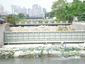 在水利水電建設(shè)中,隨著城市用水、景觀建設(shè)及環(huán)境整治和灌溉、發(fā)電的需要,翻板閘,水閘和橡膠壩得到廣泛的運(yùn)用。然而,橡膠壩等生產(chǎn)比較復(fù)雜,運(yùn)行時(shí)充水(充氣)升壩或放水(放氣)塌壩時(shí)間較長(zhǎng),影響快速截流或泄洪,再加上橡膠易老化的弊端,容易發(fā)生質(zhì)量事故。現(xiàn)在市場(chǎng)上出現(xiàn)大量鋼結(jié)構(gòu)閘門,或翻板閘但無論是提升式或臥倒式,單孔都很難適用較寬的河道。鋼壩閘是一種新型可調(diào)空控溢流閘門,它有土建結(jié)構(gòu)、帶固定軸的鋼閘門門體、啟閉設(shè)備等組成。這種建筑物適合于閘孔較寬(10米~~100米)而水位差比較小的工況(1~~7米),由于它可以設(shè)計(jì)的比較寬,可以省區(qū)數(shù)孔閘墩,所以不僅結(jié)構(gòu)簡(jiǎn)單,可以節(jié)省不少土建投資,而且可以立門蓄水,臥門行洪排澇,適當(dāng)開啟調(diào)節(jié)水位,還可以利用閘門門頂過水,形成人工瀑布的景觀效果。
