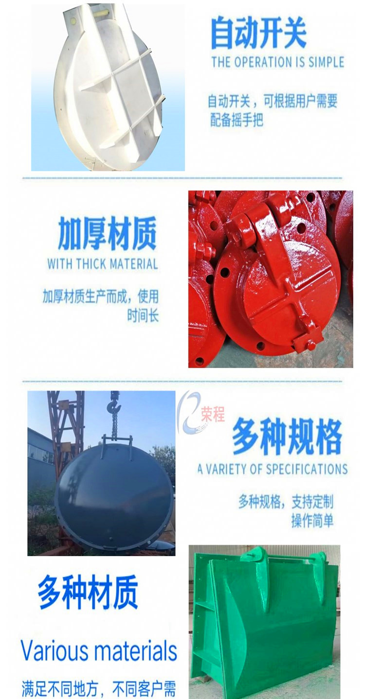 拍門可以做成圓的和方形的,還設備廣泛應用于泵站出口的斷流自動控制,或用于江河海邊無人管理的水利排水口,在順利排水的同時又防止水流倒灌,安全,實用,節能,不需任何電力,液壓動力等外力,靈活,可靠,是現代水利管理不錯節能產品。業務咨詢13582492022孫經理,微信同號。
