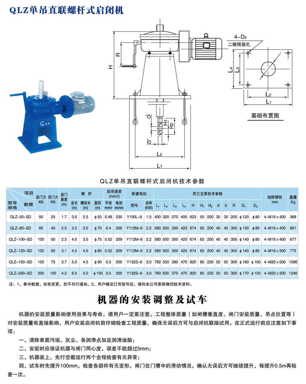四、試車時先提升100mm,檢查各部件有無變形,閘門在門槽中的滑動情況,確認無誤后方可繼續提升,沒提升0.5m再檢查一次。